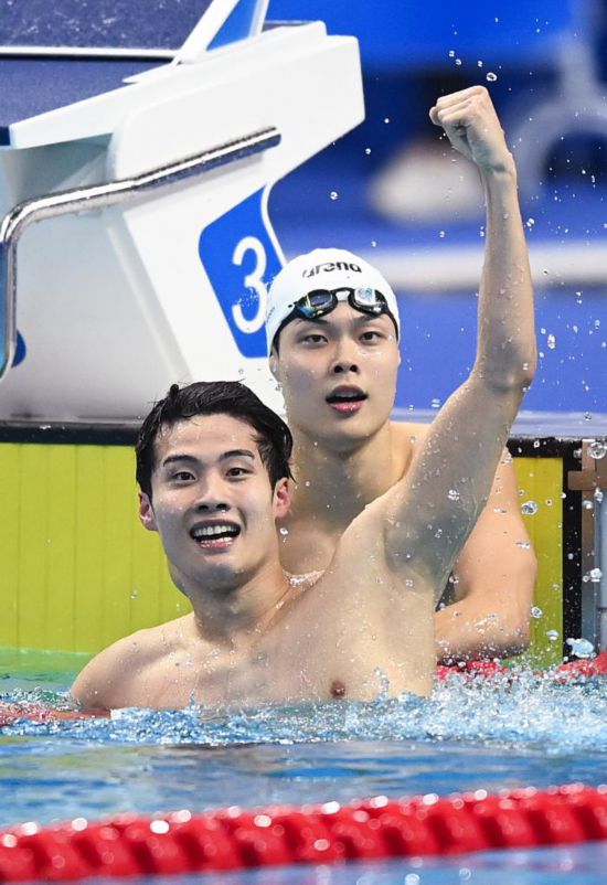 2023年9月27日,韩国选手黄宣优(前)在杭州亚运会游泳项目男子200米自由泳决赛后庆祝夺冠。新华社记者 黄宗治 摄